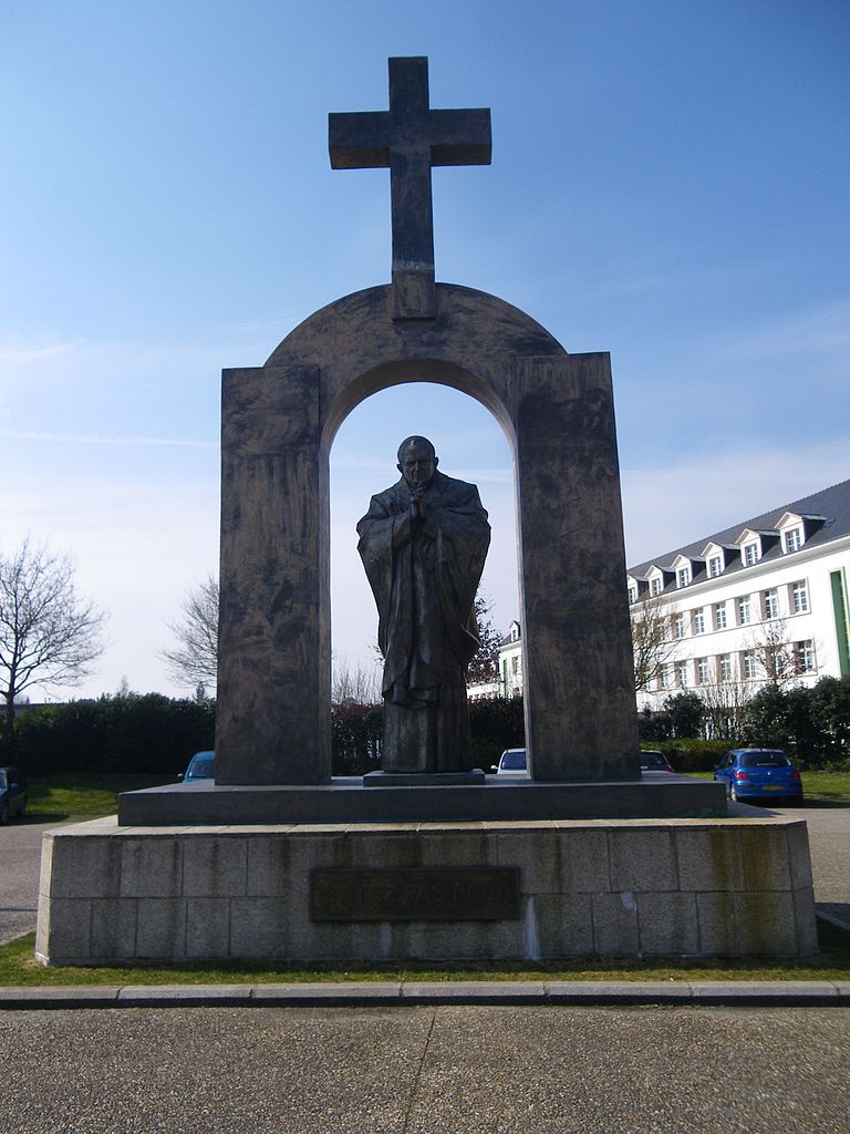 The statue, which was donated by Russian artist Zurab Tsereteli to the small northwestern town of Ploermel in 2006, depicts the late pope praying beneath an arch adorned with a cross.