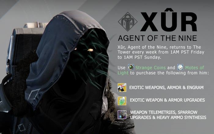 Gamers who play "Destiny" every week are going to get another bag of exotic gear this week. As usual, Xur sells these exotic pieces of weapons and armor in the social hub of the game and gamers can use Strange Coins to purchase them.
