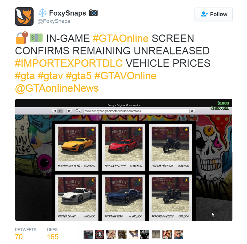 "GTA" tipster Foxy Snaps shared an image showing the next batch of vehicles that Rockstar Games is expected to release in the coming days.