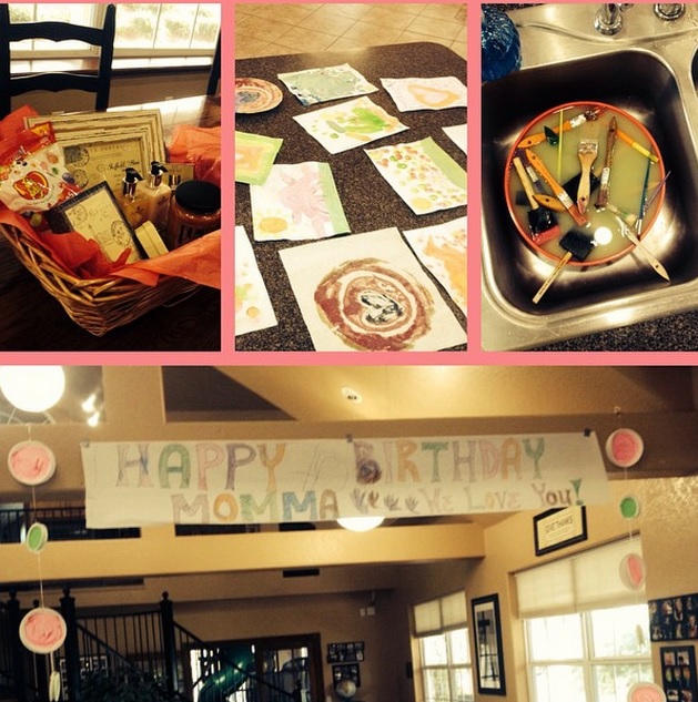 Photos posted to "The Duggar Family" Twitter handle show a birthday gift basket filled with Jelly Bellys, lotion and candles, as well as a sign painted by the children that reads: "Happy Birthday Momma! We Love you!"