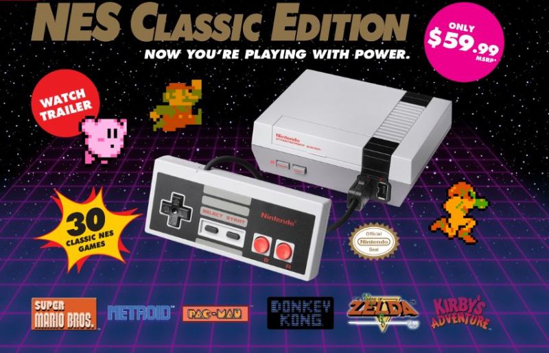 Nintendo's NES Classic Edition features a sleeker, smaller version of its original model. It also comes with a standard HDMI to allow users to connect the console to their TVs. Each console is packaged with an NES Classic Controller and an AC adapter. It also comes with 30 pre-installed games, which include fan favorites "Super Mario Bros.," "Dr. Mario," "Donkey Kong," "Donkey Kong Jr.," "PAC-MAN," "The Legend of Zelda," "Final Fantasy," "Kirby's Adventures," "Castlevania," "Bubble Bobble," "Ninja Gaiden," "Metroid," and "Mega Man."