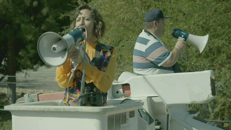 Meanwhile, Tandy (Will Forte) stumbles upon a T-Rex costume and puts it on to perhaps try and cheer his friends up. Gail becomes desperate and takes out her dummy Gordon's head to try and pry the elevator doors open. Carol and Todd scour the streets on a bucket truck in search of their missing comrades.